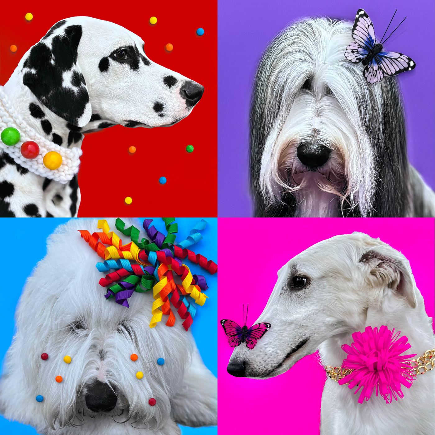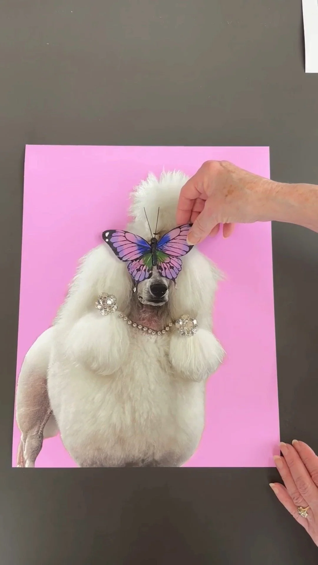 Lady is elegance with a playful twist. This graceful pup, adorned with a bold pink statement collar and a delicate butterfly visitor, feels both refined and whimsical. Set against a vibrant pink backdrop, Lady radiates charm, confidence, and just the right touch of drama.